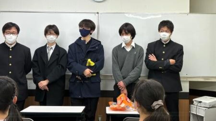 卒業生も応援に駆けつけ、恒例のお菓子配り。