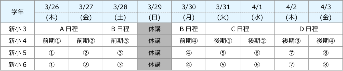 | 新小3・新小4 | 4日間~ | 費用は3月ないし4月授業料に含まれております。 講習期間のみ受講の場合は「1ヶ月分の通常授業料+システム利用料」が発生いたします。 |