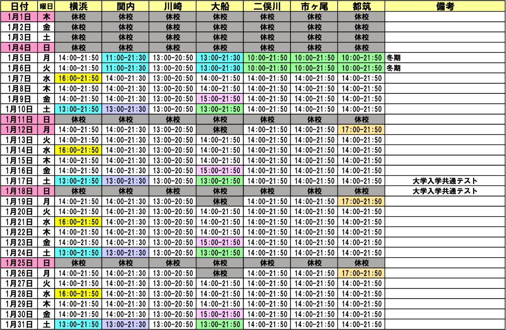高等部 12月・1月開講スケジュール
